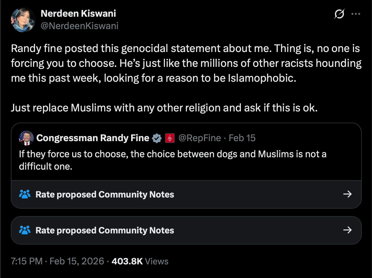 The Rep. Randy Fine vs Islamist woman over a dog post on X (you can read the backstory here) isn’t about dogs. Ever since she posted her original remark, notorious Islamist and pro-Hamas activist Nerdeen Kiswani has tried walking it back, claiming that she was “just joking” after her frillionth post about it.