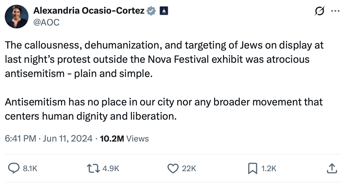 Per the conservative bastion that is the New York Times, Kiswani has led chants like "The state of Israel has got to go!” and "Globalize the intifada!" at various college violent riots protests. The NYT reported that Kiswani even led protests, Hamas flags waving, against memorials for October 7th victims, something for which even members of the far left criticized her. She and her group blamed the Nova Festival victims for the 10/7 attacks and chanted: “On October 7th, on the Nova Music Festival A.K.A [also known as] the place where Zionists decided to rave next to a concentration camp. That's exactly what this music festival was. It's like having a rave right next to the gas chambers during the Holocaust.”