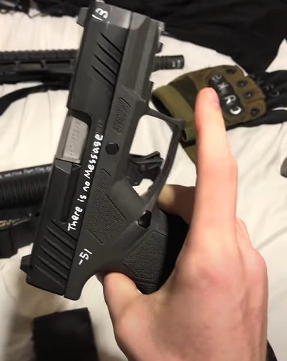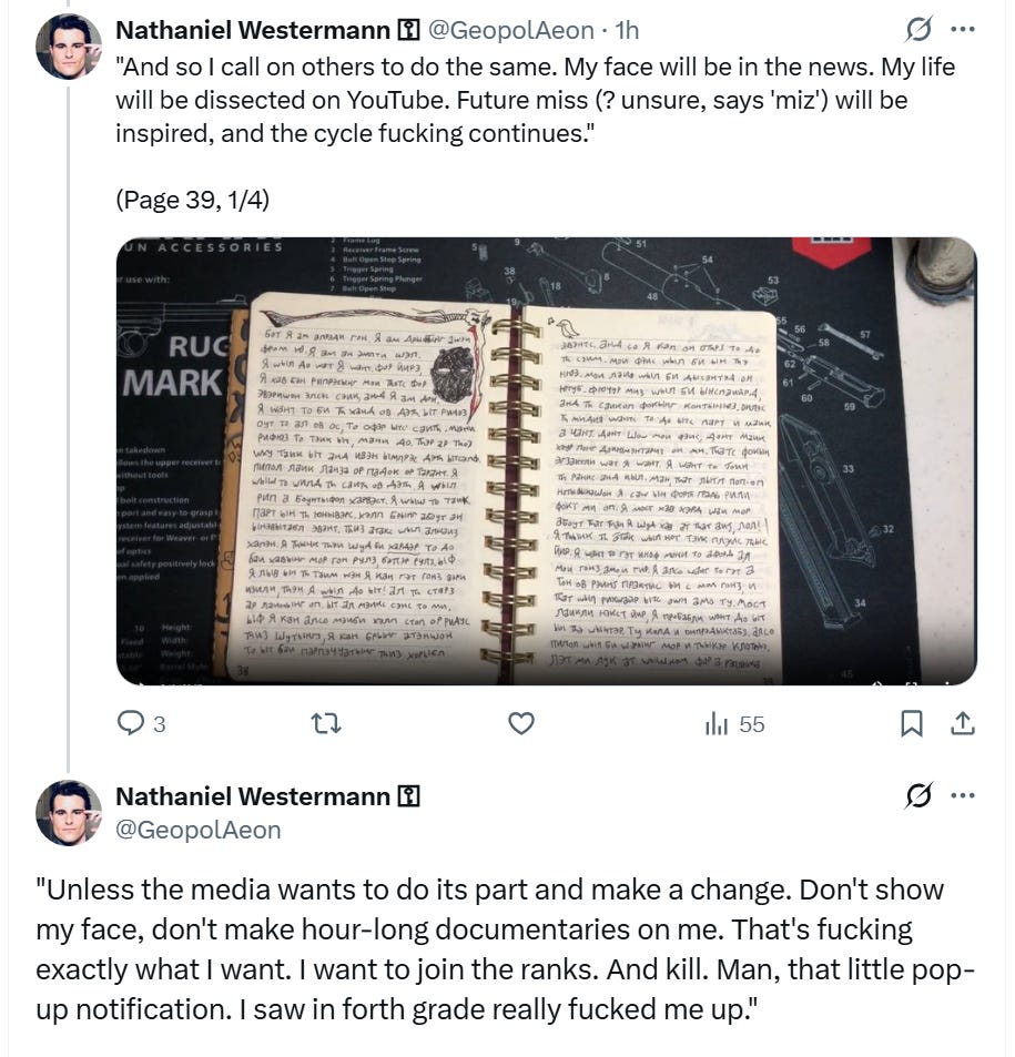 The videos show that he decorated his weapons (an AR-15 rifle, a Mossberg 590 Cruiser shotgun, a Smith & Wesson M&P compact 9mm handgun, and a revolver, all purchased legally) much like the New Zealand Christchurch shooter. There is a thread of them on X, but the one that stands out to me, especially after reading through the translations of his diary, is the one on his 9mm: “There is no message.”