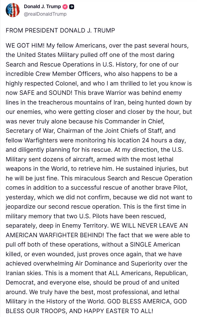 Just after midnight, in the wee hours of Easter morning, President Donald Trump broke his silence to announce that the missing Weapons Systems Officer (WSO) from Friday’s downed F-15E had been recovered and was safely in Kuwait receiving medical treatment.
