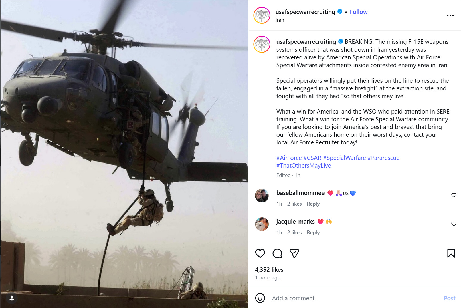 About 9 PM eastern, word spread on X via various OSINT and other sources that a massive firefight had broken out near the city of Dehdasht. At 9:20 PM, author Toby Harden claimed that an officer overseeing the CSAR operation told him that the WSO had been extracted after scaling a 7,000 ft ridge while evading enemy capture. About 30 minutes later, a post, which has since been deleted, appeared on the USAF Spec War Recruiting Instagram claiming that the WSO had been recovered. It was the first time any official account mentioned the matter.